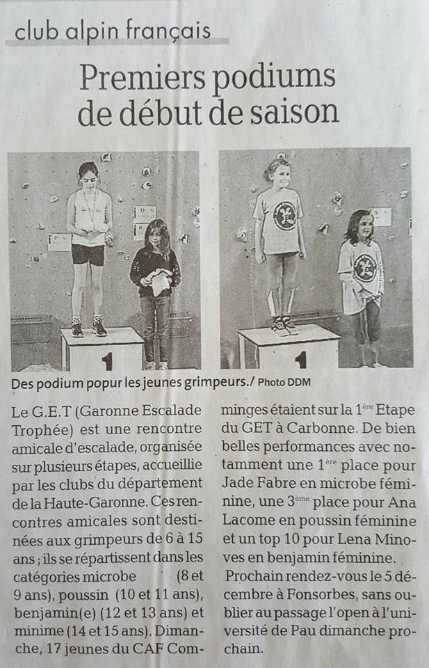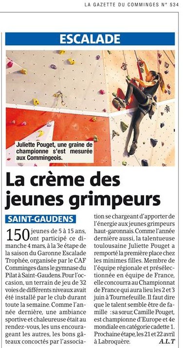 Du haut de ses 15 ans, Johann Saint-Blancat a déjà tout d'un grand grimpeur. Cette année en compétition U18, il a fait briller le CAF Comminges. Il a rejoint récemment le groupe performance escalade en venant faire ses études à Gourdan-Polignan au lycée Paul-Mathou en seconde TP. Pour sa première année au sein du groupe, Johann a remporté en début de saison une coupe Occitanie de bloc à Cahors. Il a terminé 11e à la demi-finale Sud de France du championnat de France. Ce dernier résultat l'a logiquement qualifié au championnat de France de difficulté à Saint-Étienne qui a eu lieu les 17 et 18 mai. Il termine 36e pour son premier championnat de France de difficulté.